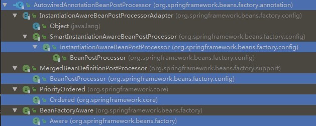- 首先点开@Autowired,注释上写Please consult the javadoc for the AutowiredAnnotationBeanPostProcessor,让我们去查阅这个类,看一下这个类的继承关系树,如下: