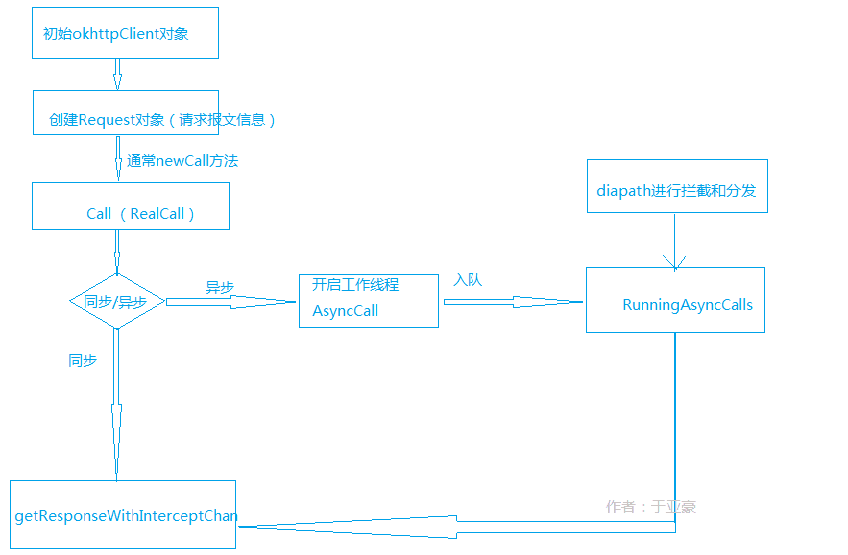 从上图可以看出,不管是同步请求还是异步请求,我们都需要创建一个OKhttpClient对象,用到的是build构造者模式,创建Request对象,然后再OKhttpClient的newCall方法和Request来封装我们的call对象。创建我们的实际请求的call对象,从上图可以看到,对于同步请求,我们调用的是excute方法,异步请求调用的是equeue方法。