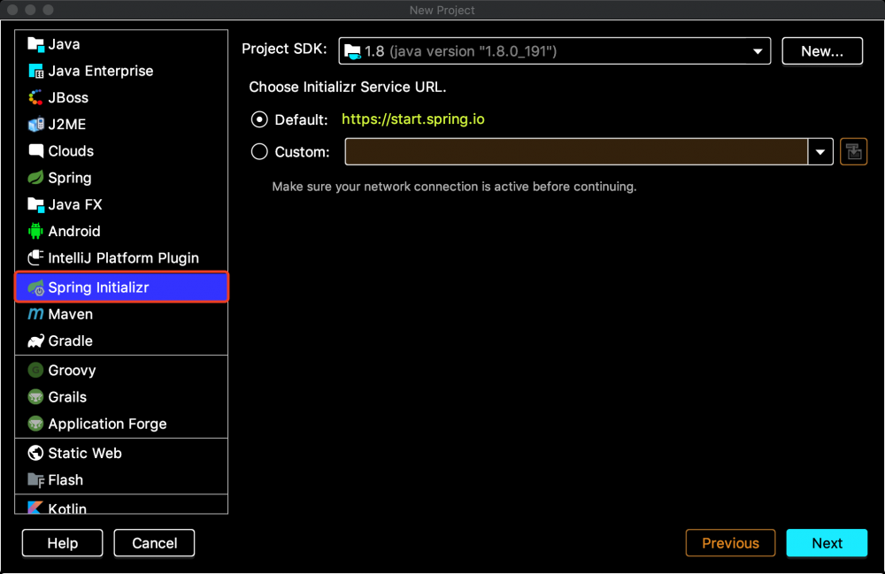 创建Spring Boot的项目和创建Spring的项目不同,在上图中我们不能选择Maven创建项目,而是使用IDEA中Spring Initializr创建Spring Boot项目。因为它会为我们直接生成Spring Boot的项目架构。在Spring Initializr选项中我们看到默认使用了 https://start.spring.io>这个... 这个域名地址,来生成我们的项目架构。下图就是我们直接访问上述域名来生成项目架构。
