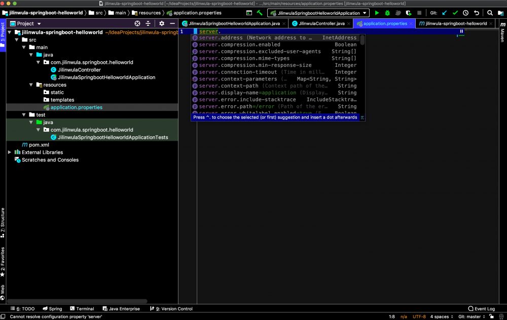 并且如果我们使用IDEA开发工具时,当我们在在application.properties文件中输入参数时,IDEA就会自动为我们提供相关参数提示,这样方便我们修改。也就是如下图所示: