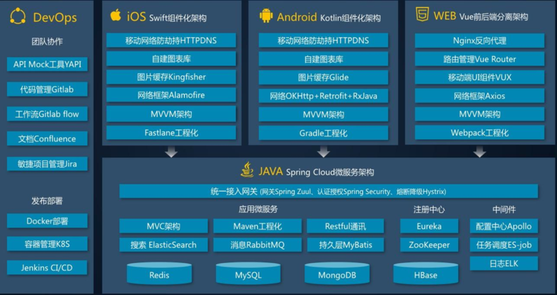 没有祖传代码,我们可以比较开放、客观的在目前主流技术上进行选型,充分考量并平衡各技术方案的当下稳定性、生态及未来发展性。下图为我们既定的技术栈架构图: