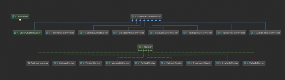 图有点小,见谅,不过可以眯着眼睛看稍微能看出来一点,每一个Cluster实现类都对应着一个invoker,因为这个模式启用的时间点就是在调用的时候,而我在之前的文章里面讲过,invoker贯穿来整个服务的调用。不过这里除了调用失败的一些模式外,还有几个特别的模式,他们应该说成是失败的措施,而已调用的方式。