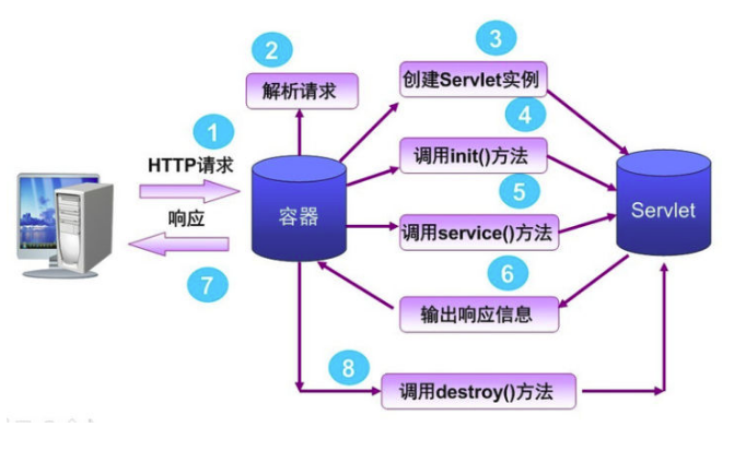 即,当http请求发出以后,在容器内解析http请求,创建出servlet实例,接着,再次调用init方法,接着再次调用service方法,最后由servlet输出响应信息,对于更多的请求来说,将会调用destroy()方法,最后把响应返回给客户端。