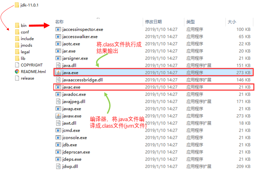 当安装好jdk后(本示例jdk版本为11.0.1,不同版本,目录有细微差别,但bin目录包含的exe是一样的),打开bin目录,有两个重要的exe文件:javac.exe(编译器)