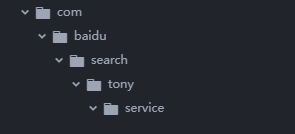 如百度的搜索业务,假如其所有者为tony,当前为service层,则当前的包名理论上应该为: com.baidu.search.tony.service ,其中的 . 代表目录分层,按照当前包名,你应该得到一个如 com/baidu/search/tony/service 的目录结构: