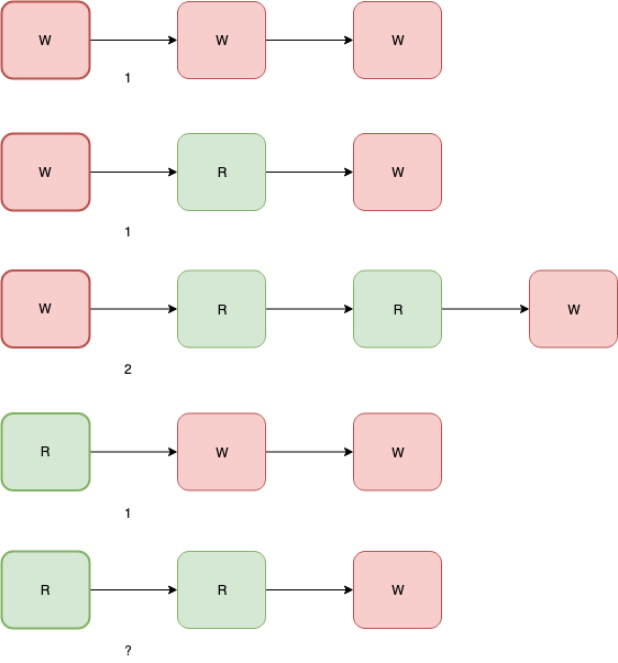 可以看到,从没有任何线程持有锁的状态1变成2或者3时,reader count和writer count分别变化,这个特性导致你必须同时CAS reader count和writer count,或者混合成一个变量,分别用低位和高位来区别reader count和writer count(或者用正数和负数也可以)。AQS采用的是后者。这里简化一下,并给几个简单的关系式: