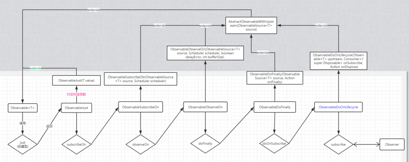 source 就是上游操作符返回的 Observable 的子类对象,通过 AbstractObservableWithUpstream 的构造函数传递给下游的.这里去调用了上一个 Observable 对象的 subscribe 方法.这个调用由下至上,直到整个流程的起始处.