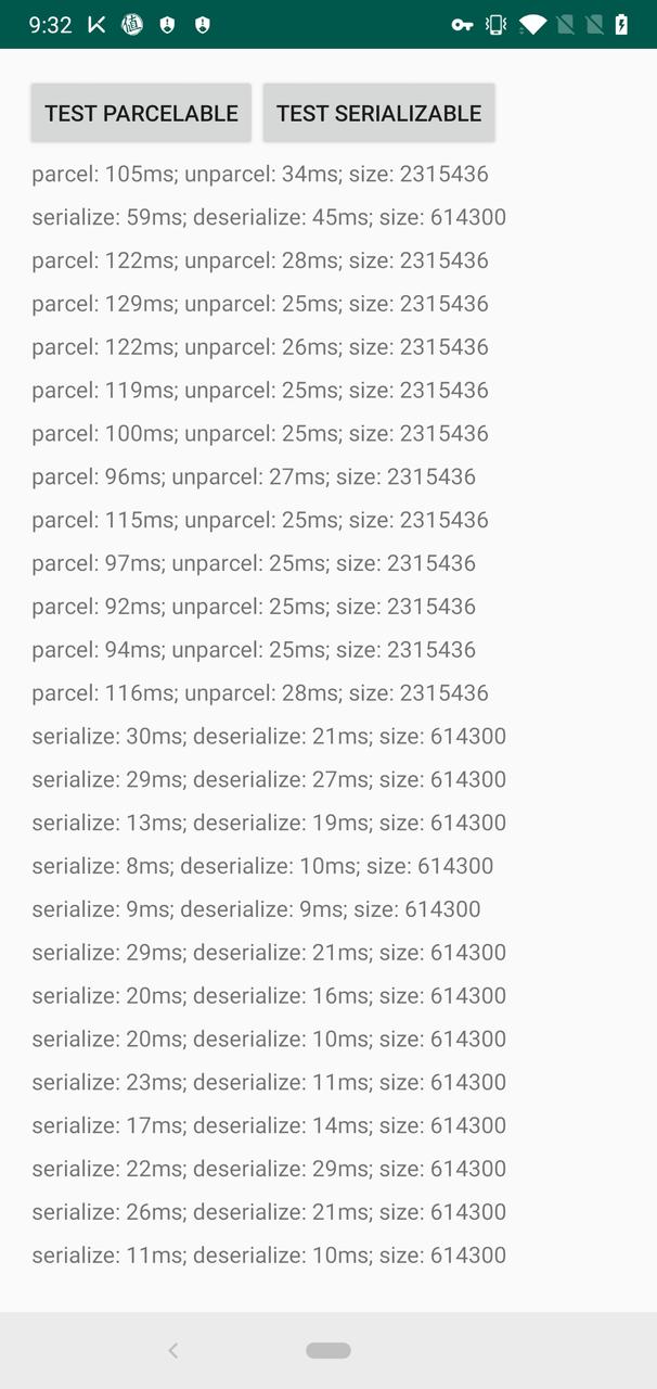 Usual Java serialization on an average Android device (if done right *) is about 3.6 times faster than Parcelable for writes and about 1.6 times faster for reads. Also it proves that Java Serialization (if done right) is fast storage mechanism that gives acceptable results even with relatively large object graphs of 11000 objects with 10 fields each. * The sidenote is that usually everybody who blindly states that "Parcelable is mush faster" compares it to default automatic serialization, which uses much reflection inside. This is unfair comparison, because Parcelable uses manual (and very complicated) procedure of writing data to the stream. What is usually not mentioned is that standard Java Serializable according to the docs can also be done in a manual way, using writeObject() and readObject() methods. For more info see JavaDocs. This is how it should be done for the best performance.