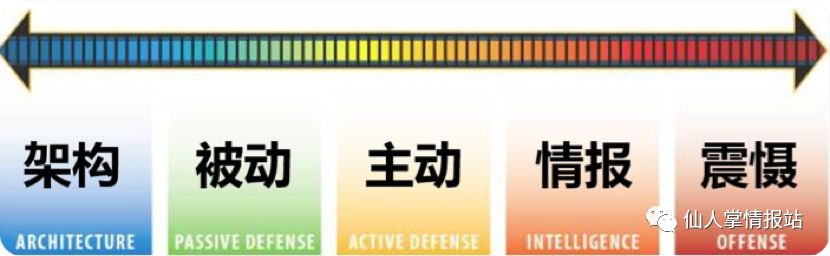 SANS网络安全活动标尺模型将网络安全建设投入及工作方向划分为五个阶段:架构、被动、主动、情报和震慑。