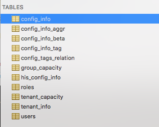 第二步:初始化MySQL数据库,数据库初始化文件: nacos-mysql.sql ,该文件可以在Nacos程序包下的 conf 目录下获得。执行完成后可以得到如下图所示的表结构: