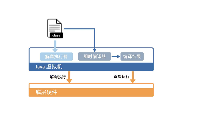 不过光是Java字节码还是无法运行,Java虚拟机还需要将字节码翻译成机器码,HotSpot有2种形式:第一种是解释执行,即将字节码逐条翻译成机器码并运行;第二种是即时编译(JIT),他会将一个方法内的所有字节码编译成机器码再执行.