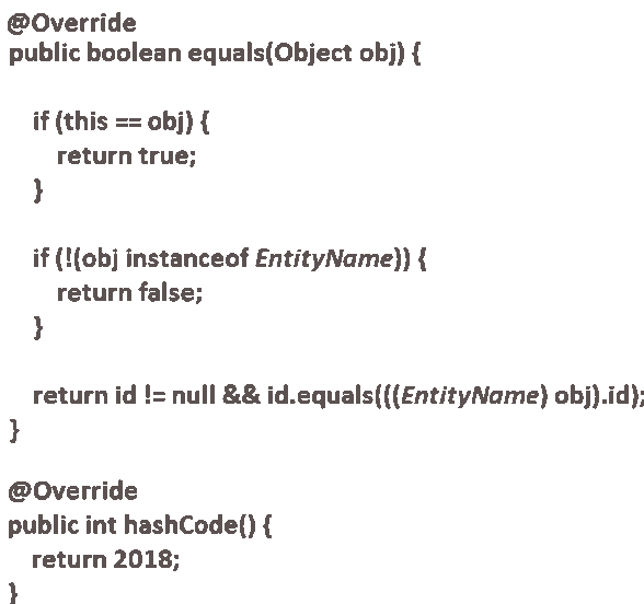 实体应实施equals()和hashCode()。主要问题是Hibernate要求实体在其所有状态转换(瞬态,附加,分离 和删除)中等于自身。使用Lombok @EqualsAndHashCode不会尊重此要求。