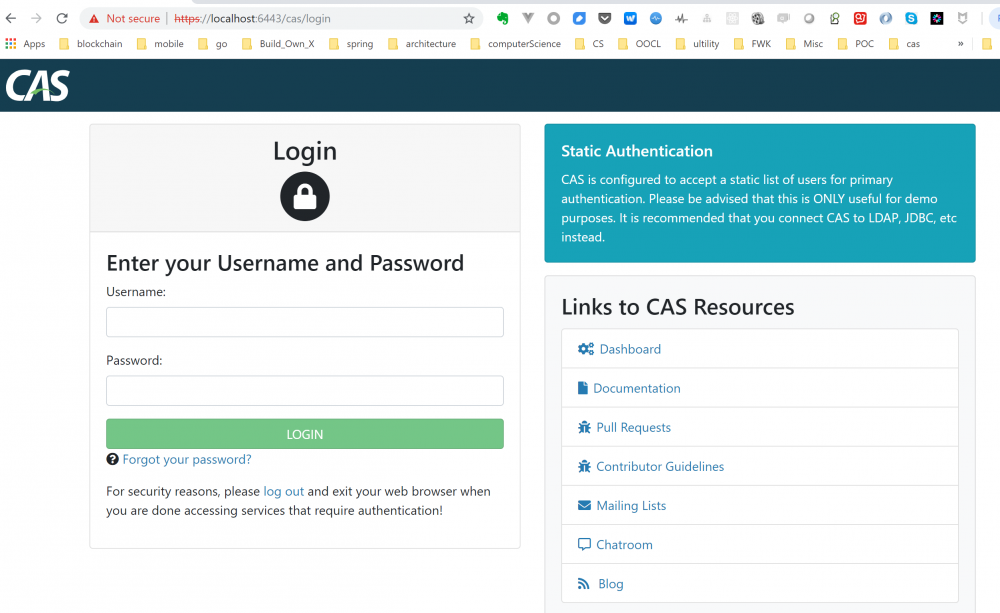 重新 build package , build run ,打开登录页面 https://localhost :6443/cas, 输入用户名casuser,密码Mellon,应该就可以登录成功了