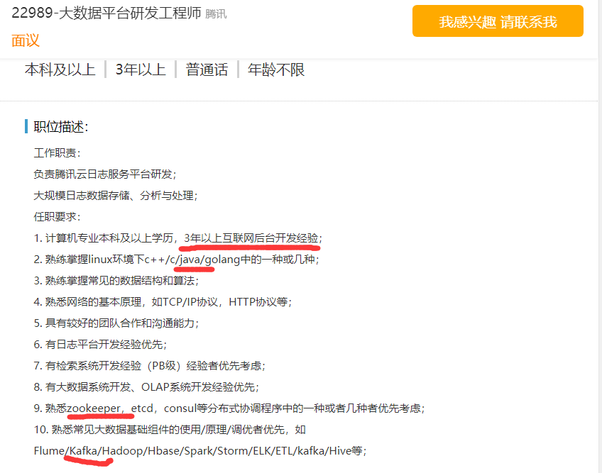可以看到,无论是哪个职位,都要求了Java的开发经验,并且,腾讯的大数据职位明显要求了需要有Java后台开发三年经验。