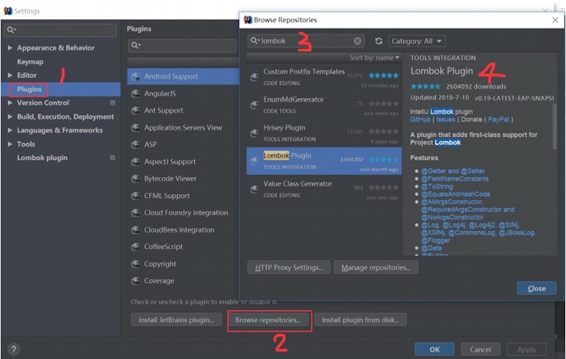 1.依次点击Preferences - Plugins,搜索lombok,最后点击Lombok Plugin (对,就下载最多的那个)intall。