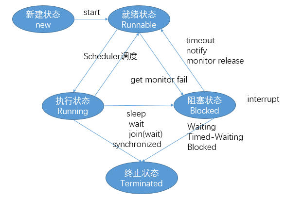 由于Scheduler(调度器)的时间片分配算法,每个Running的线程会执行多长时间是未知的,因此线程能够在Runnable和Running之间来回转换。 阻塞状态的线程必须先进入就绪状态才能进入执行状态 。