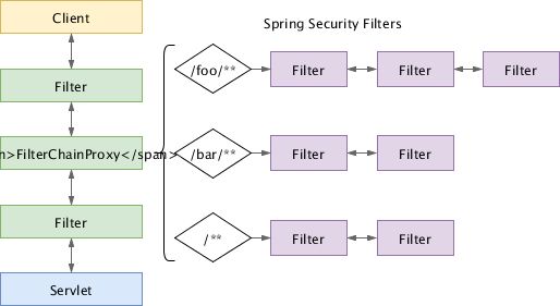Java Servlet 和 Spring Security 都使用了设计模式中的 责任链模式 。简单地说,它们都定义了许多过滤器(Filter),每一个请求都会经过层层过滤器的处理,最终返回。如下图: