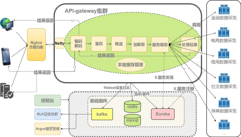 图中描绘了API网关系统的处理流程,以及与服务注册发现、日志分析、报警系统、各类爬虫的关系。其中API网关系统接收请求,对请求进行编解码、鉴权、限流、加解密,再基于Eureka服务注册发现模块,将请求发送到有效的服务节点上;网关及抓取系统的日志,会被收集到elk平台中,做业务分析及报警处理。