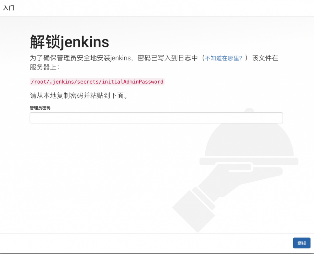 第一次打开 jenkins web 界面,要求输出管理员初始密码,生成在服务器上,界面上提示有路径