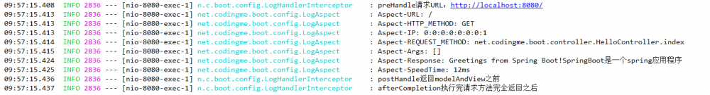 09:57:15.408 INFO 2836 --- [nio-8080-exec-1] n.c.boot.config.LogHandlerInterceptor : preHandle请求URL:http://localhost:8080/ 09:57:15.413 INFO 2836 --- [nio-8080-exec-1] net.codingme.boot.config.LogAspect : Aspect-URL: / 09:57:15.413 INFO 2836 --- [nio-8080-exec-1] net.codingme.boot.config.LogAspect : Aspect-HTTP_METHOD: GET 09:57:15.413 INFO 2836 --- [nio-8080-exec-1] net.codingme.boot.config.LogAspect : Aspect-IP: 0:0:0:0:0:0:0:1 09:57:15.414 INFO 2836 --- [nio-8080-exec-1] net.codingme.boot.config.LogAspect : Aspect-REQUEST_METHOD: net.codingme.boot.controller.HelloController.index 09:57:15.415 INFO 2836 --- [nio-8080-exec-1] net.codingme.boot.config.LogAspect : Aspect-Args: [] 09:57:15.424 INFO 2836 --- [nio-8080-exec-1] net.codingme.boot.config.LogAspect : Aspect-Response: Greetings from Spring Boot!SpringBoot是一个spring应用程序 09:57:15.425 INFO 2836 --- [nio-8080-exec-1] net.codingme.boot.config.LogAspect : Aspect-SpeedTime: 12ms 09:57:15.436 INFO 2836 --- [nio-8080-exec-1] n.c.boot.config.LogHandlerInterceptor : postHandle返回modelAndView之前 09:57:15.437 INFO 2836 --- [nio-8080-exec-1] n.c.boot.config.LogHandlerInterceptor : afterCompletion执行完请求方法完全返回之后