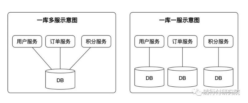 而共享数据最贱的方式就是采用共享数据库模式,也就是单体应用中最常用的方式,一般只有一个数据库,如图一库多服和一库一服的方式: