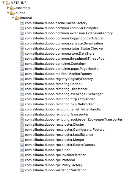 注意:这里的配置文件是放在你自己的 jar 包内,不是 dubbo 本身的 jar 包内,Dubbo 会全 ClassPath 扫描所有 jar 包内同名的这个文件,然后进行合并。