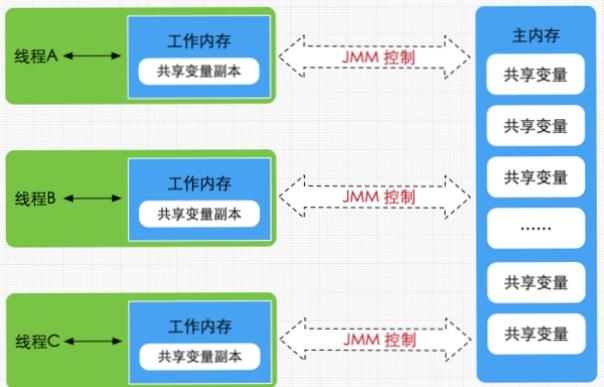 JMM规定Java每个线程都有自己的工作内存(Working Memory),线程的工作内存中有共享变量的副本,共享变量则存放在主存(Main Memory)中。工作内存是线程私有的,而主存则是所有线程共享的。工作内存用于存放线程私有的数据。而Java内存模型中规定所有变量都存储在主内存,主内存是共享内存区域,所有线程都可以访问,但线程对变量的操作(读取赋值等)必须在工作内存中进行。首先要将变量从主内存拷贝的自己的工作内存空间,然后对变量进行操作,操作完成后再将变量写回主内存,不能直接操作主内存中的变量,工作内存中存储着主内存中的变量副本拷贝,前面说过,工作内存是每个线程的私有数据区域,因此不同的线程间无法访问对方的工作内存,线程间的通信(传值)必须通过主内存来完成,其简要访问过程如下图: