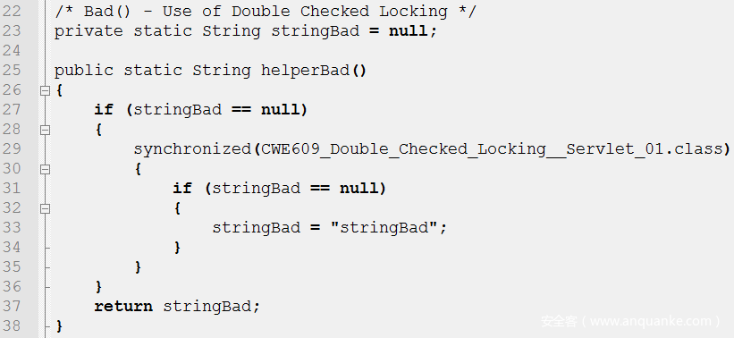 示例源于Samate Juliet Test Suite for Java v1.3 (https://samate.nist.gov/SARD/testsuite.php),源文件名:CWE609_Double_Checked_Locking__Servlet_01.java。
