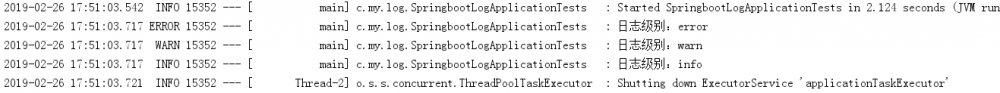 2019-02-26 17:42:46.806 INFO 14072 --- [ main] c.my.log.SpringbootLogApplicationTests : info