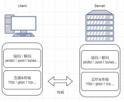 client:封装参数-> 编码数据->连接服务->发送数据->接收返回数据,并解码。