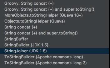如果你想知道一共有多少种方法可以进行字符串拼接,教你一个简单的办法,在Intellij IDEA中,定义一个Java Bean,然后尝试使用快捷键自动生成一个toString方法,IDEA会提示多种toString生成策略可供选择。