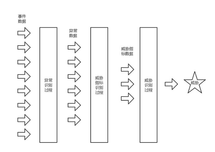 异常表示预期行为发生了变化,变化不一定威胁,但表示了可能引起关注的事件,由于大型系统中异常是海量的,所以在这一步无法进行人工介入调查。例如传入了1亿个事件,产生了100个异常,进一步处理则得到10个威胁指示,再被进一步处理得到1-2个威胁。