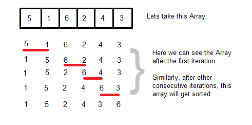 在这个数组中,我们从索引0(即5)开始,并从开始到结束对元素进行比较。因此,我们比较的第一个元素是1,因为5大于1,所以我们交换它们(因为按升序排序的数组在末尾将有更大的数字)。接下来我们比较5到6,这里没有交换,因为6大于5,并且它在高于5的索引上。现在我们将6与2进行比较,再次需要交换以将6移向末尾。在这一过程的末尾,6到达(气泡上升)数组的顶部。在下一个迭代中,5将按其位置排序,在n次迭代之后,所有元素都将排序。由于我们将每个元素与另一个元素进行比较,因此需要两个for循环,这会导致o(n^2)的复杂性。