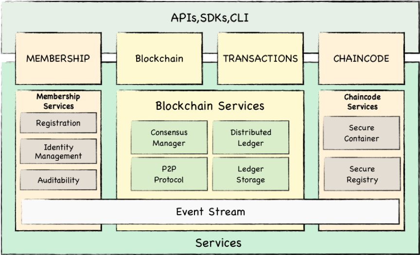 在v0.6版本中,主要分为Membership、Consensus、Chaincode、Ledger、P2P、Event Stream等核心模块。