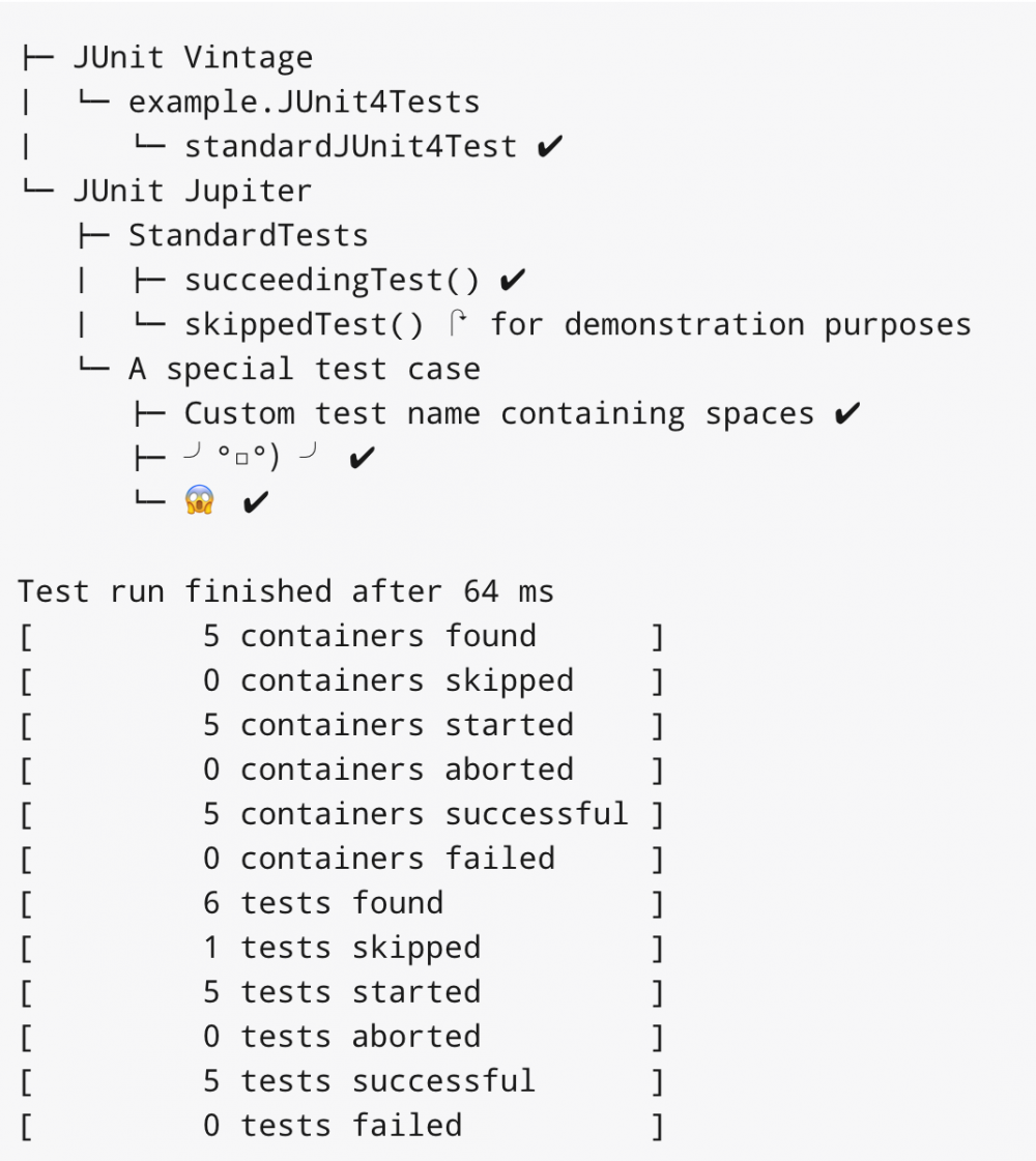 另一种可选方案是对 Maven 和 Ant 项目都使用 Console Launcher ,这是 JUnit 提供的 Java 命令行应用程序。它是一个 可执行的 Jar 文件 ,如下面的示例所示,包含多种可配置选项: