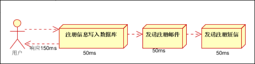 场景:用户注册,信息写入数据库后,需要给用户发送注册成功的邮件,再发送注册成功的邮件。