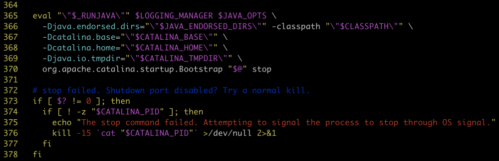 看了一下 catalina.sh: line 365 就是 stop 那里执行失败了,然后调用系统的 kill -15 杀死进程
