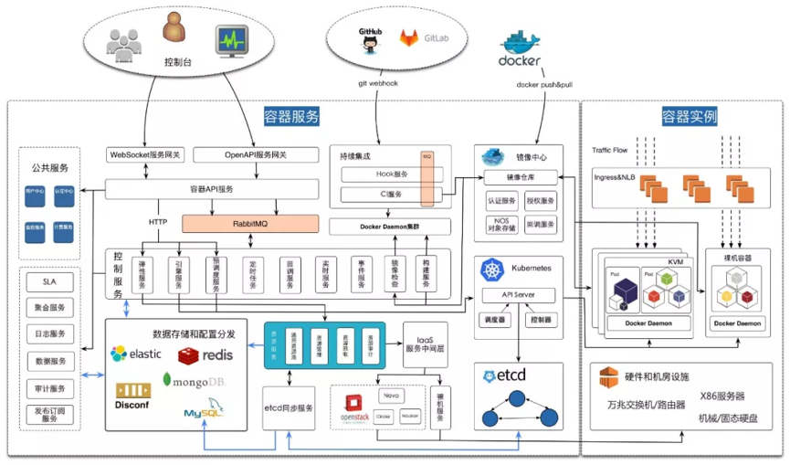 目前网易云轻舟团队以 DevOps 的方式管理着 30+ 微服务,如图所示,容器服务项目微服务化特征明显、层次划分清晰: