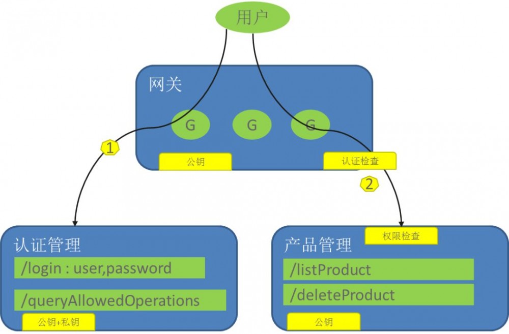 用户调用产品管理接口。 需要将Token信息从浏览器读取出来,通过Authorization头或者其他的HTTP头将信息传递下来。其他服务可以采用公钥对Token进行解密,确认用户身份,以及获取角色信息。对于身份认证的部分,可以在网关统一进行,也可以直接由业务执行。网关进行的好处是可以防止疏漏,但是会存在重复检查的成本。业务可以从Token里面解析出来角色信息,以判断访问者是否具备相关操作,比如listProduct或者deleteProduct的权限。