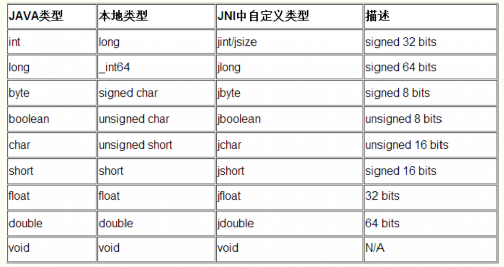 除了按照上面的方式静态注册 native 方法,我们还可以动态进行注册。动态注册的方式需要我们使用方法的签名,下面是 Java 类型与方法签名之间的映射关系: