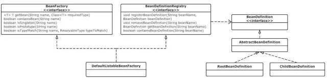 DefaultListableBeanFactory作为一个比较通用的BeanFactory实现,它同时也实现了BeanDefinitionRegistry接口,因此它就承担了Bean的注册管理工作。从图中也可以看出,BeanFactory接口中主要包含getBean、containBean、getType、getAliases等管理bean的方法,而BeanDefinitionRegistry接口则包含registerBeanDefinition、removeBeanDefinition、getBeanDefinition等注册管理BeanDefinition的方法。