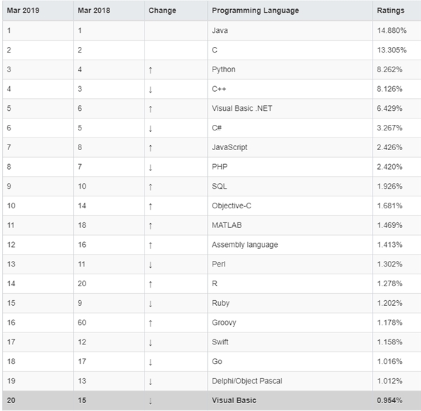 Tiobe发布了最新一期(3月份)编程语言欢迎度榜单,其榜单根据互联网上有经验的程序员、课程和第三方厂商的数量,并使用搜索引擎(如Google、Bing、Yahoo!)以及Wikipedia、Amazon、YouTube统计出排名数据。