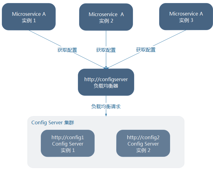 如图,各个微服务将请求发送到负载均衡器,负载均衡器将请求转发到其代理的其中一个Config Server节点。这样,就可以实现Config Server的高可用。