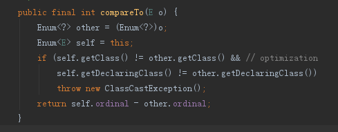 而作为继承的结果, Color 类型从 Enum<Color> 中派生出来的 compareTo 方法实际上接收的参数就是 Color类型的实例 ,这完美地达成了设计目标。