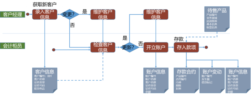 现实场景中,对公客户经理录入客户信息时很可能对方还只是潜在客户或者客户并没有马上进行开户操作,而是隔了一段时间之后才开户,这时客户信息可能需要更新。如果是客户经理首先了解到需要变更客户信息,则会走上边泳道中流程;如果客户直接去了柜台,柜员则会首先检查客户信息,这时发现需要更新,则可以走下边泳道这个过程,更新之后再开立账户。图中也可以发现,原本没有“检查客户信息”这个任务,在最初的建模过程中,它是可以写在开立账户这个任务中的,但是在细化流程阶段,则可以考虑是不是将其独立出来。这个取决于整体的架构判断,如果其他流程中也涉及这种拆分,确实可以调整企业级业务架构模型,如果不涉及或者很少领域涉及,也可以将其标记为“开立账户”任务的衍生。这种细化可能产生新的数据需求,设计新的数据实体,或者在原有的数据实体下产生根据某种维度细分的子实体。