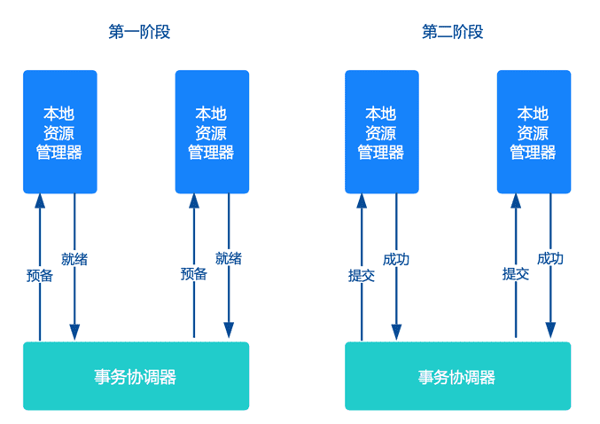 该方案最早由oracle提出用于解决跨数据访问的事务问题,是一种强一致性的解决方案,由事务协调器和本地资源管理器共同完成。事务协调器和资源管理器间通过XA协议进行通信。XA协议实现的原理入下图所示,共分为两个阶段,也就是我们常说的两阶段协议。