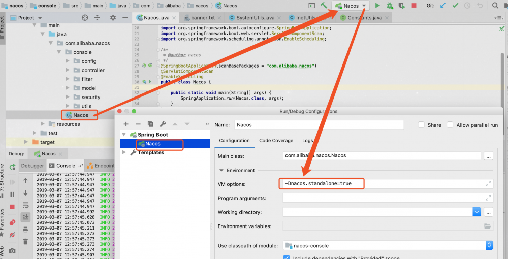 访问 https://github.com/alibaba/nacos ,使用Git克隆Nacos代码,直接导入到IDEA中,如下所示设置启动参数,直接启动。