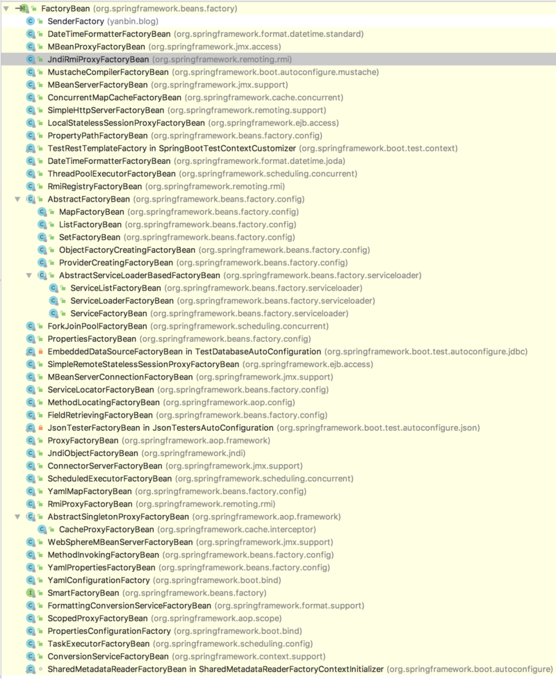 原本不太想细究它,由于看到了 FactoryBean 下的子子孙孙们,意识到在以后的 Spring 应用中还是大有文章可做。下面是在一个最基本的 SpringBoot 项目中的 FactoryBean 的所有实现类