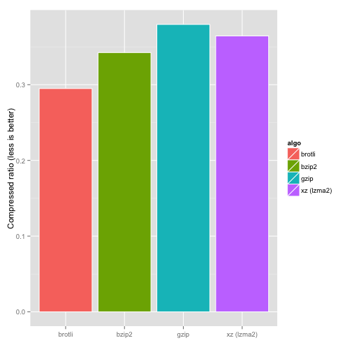 Brotli 是 Google 工程师开发的开源压缩算法,目前已经被新版的主流浏览器支持,作为 HTTP 传输的压缩算法。下面是在网上找到的关于 Brotli 和其他常见压缩算法对比基准测试。