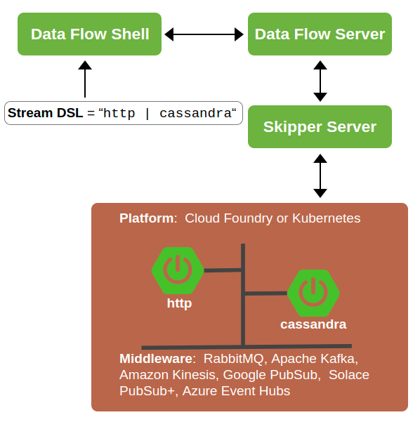 1.x系列的 Data Flow Server 允许直接部署流,或者委托给 Skipper。而现在只剩下一个选项,即通过 Skipper 部署到受支持平台,为长期存在的流应用提供滚动升级和降级功能。架构上,任务仍像之前一样由 Data Flow Server 部署,但现在可以跨平台部署。有关该功能的更多信息,请参见下图。